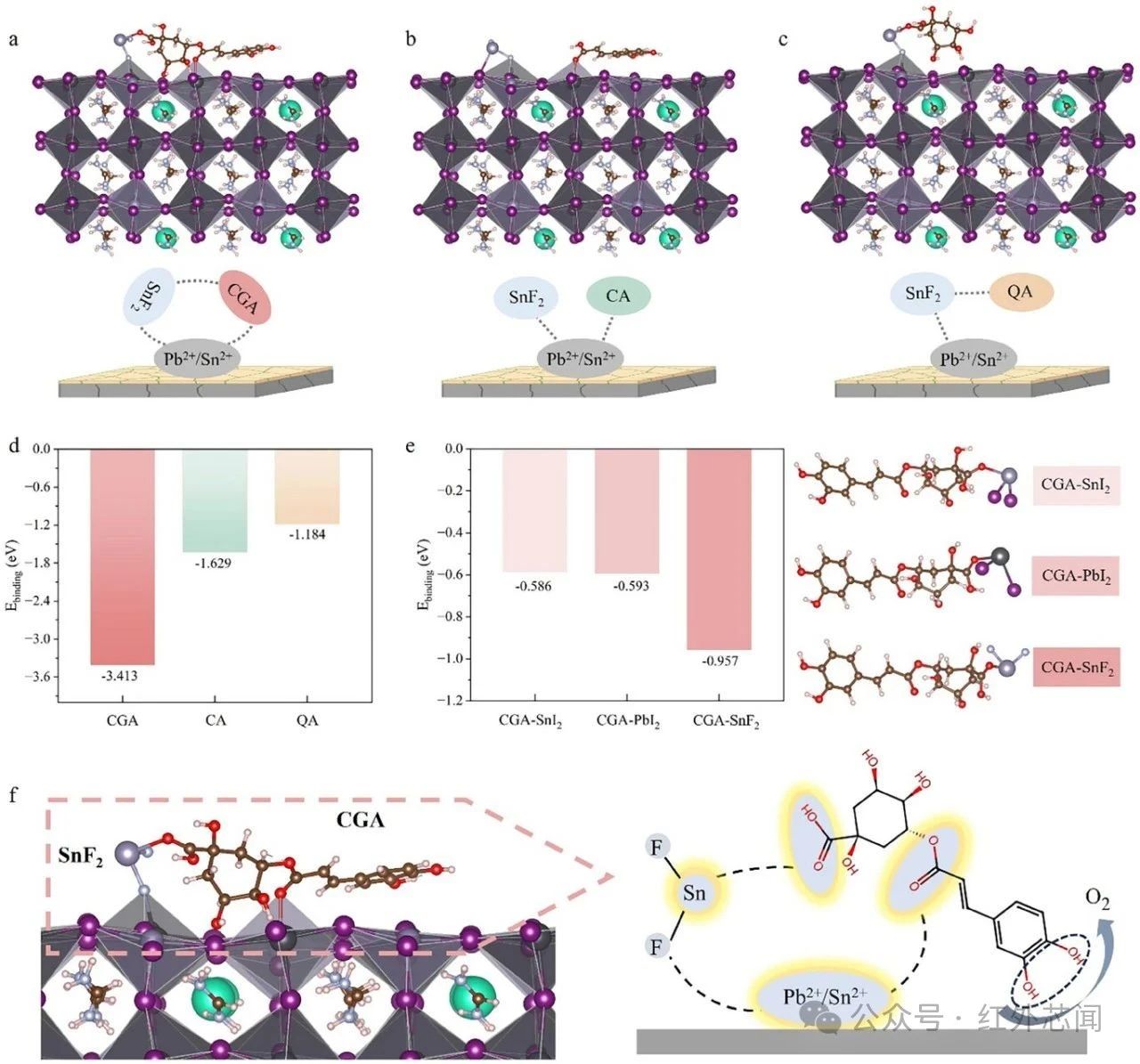 为了提高锡铅钙钛矿的抗氧化能力,研究人员引入了包括CGA、CA和奎宁酸(QA)三种酸,测试了其结构及还原能力,相关结果如图1所示。接着,研究人员首先使用密度泛函理论计算,来揭示了CGA与锡铅钙钛矿及SnF₂之间形成的独特三系统互锁结构及其稳定性,相关结果如图2所示。