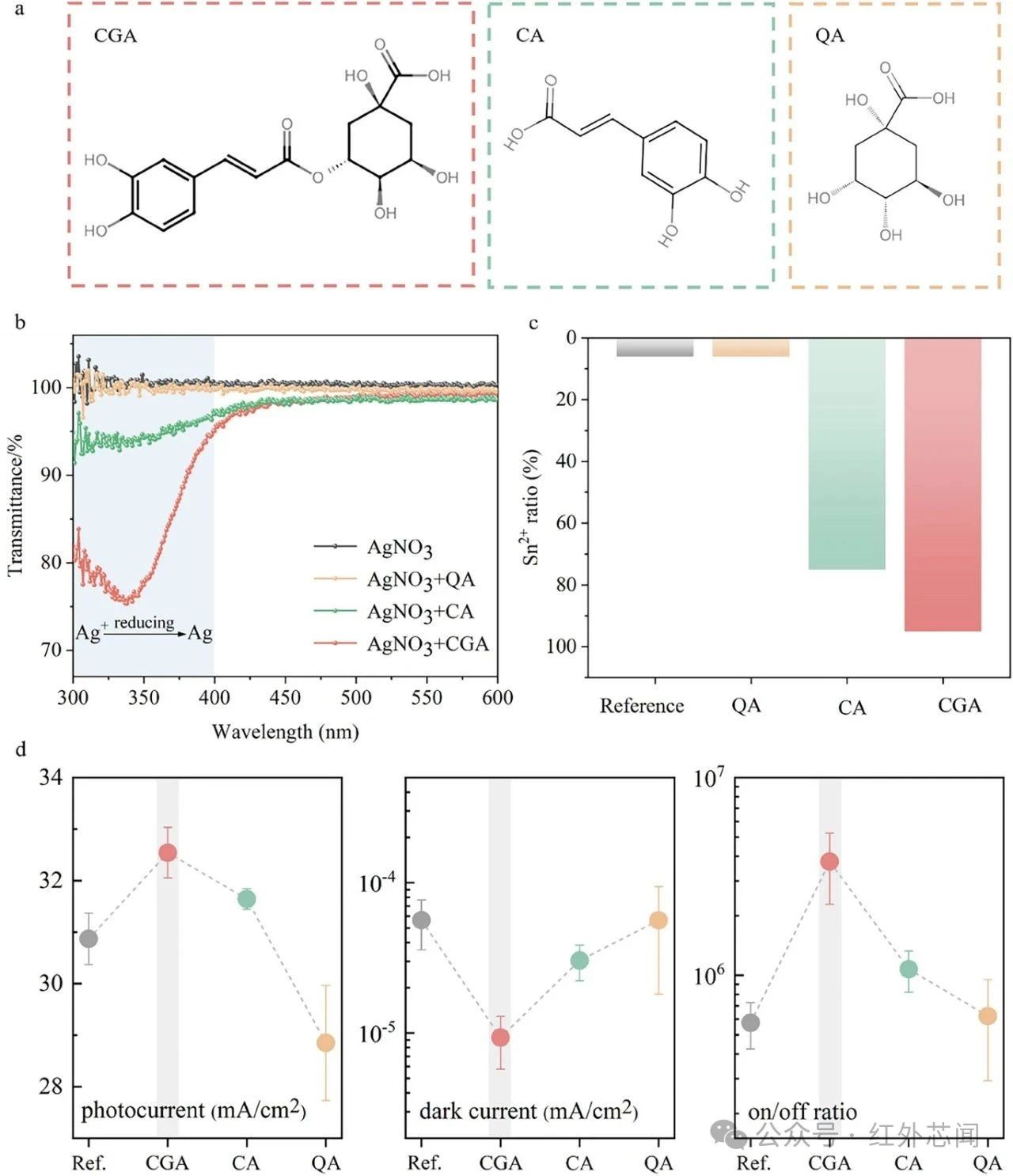 综上所述,这项研究通过引入天然还原剂CGA构建三系统互锁顶包覆结构,巧妙地解决了锡铅钙钛矿光电探测器中氧化和缺陷问题,实现了高性能的近红外光电探测器。该研究创新性地利用天然小分子添加剂实现材料性能的调控,为钙钛矿材料的改性提供了新思路;并通过理论计算与实验相结合,深入揭示了CGA与钙钛矿之间的相互作用机制,为后续研究提供了理论依据。此外,该研究还可以进一步改进,例如探索CGA添加剂在不同环境条件下的稳定性,以及研究其在其他钙钛矿体系中的普适性,从而拓展该方法的应用范围。