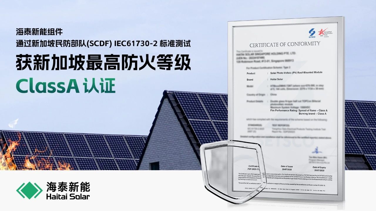 近日,海泰新能光伏组件成功通过新加坡民防部队(SCDF)IEC 61730-2标准测试,并获得新加坡最高防火等级Class A认证,实力认证公司组件产品在安全可靠性方面的优势。