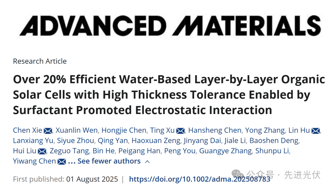Chen Xie,* Xuanlin Wen, Yiwang Chen*, et al. Over 20% Efficient Water-Based Layer-by-Layer Organic Solar Cells with High Thickness Tolerance Enabled by Surfactant Promoted Electrostatic Interaction, Advanced Materials, 2025, e08783.