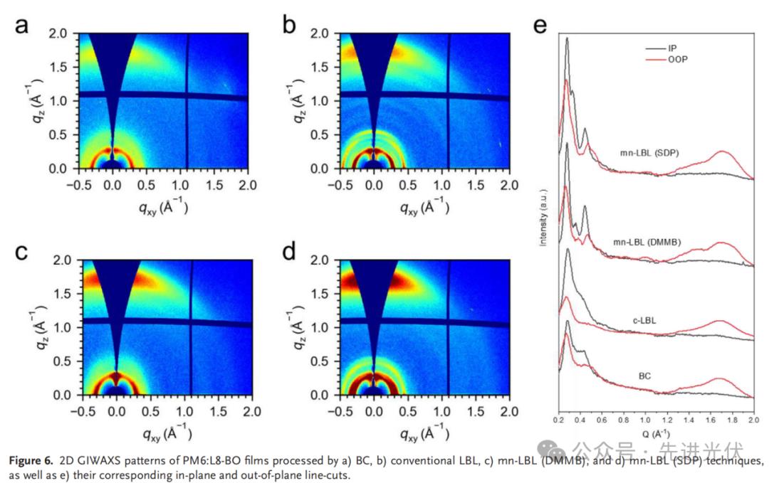 图6:结晶取向调控与电荷传输优化GIWAXS表征揭示SDP双阴离子头基显著提升分子有序性:(100)晶面衍射位移至q=0.282 Å⁻¹(d-间距22.3 Å),畸变率降低35%,(010)π-π堆叠峰 强度提升40%(面外面内强度比达2.37)。高度取向的face-on结构使面外/面内峰强比达2.37,构建垂直主导的电荷传输通道,空穴迁移率各向异性比优化至3.1:1,直接支撑300 nm厚膜中76.2%的创纪录填充因子(较BHJ工艺提升13%),破解厚膜器件电荷阻塞难题。