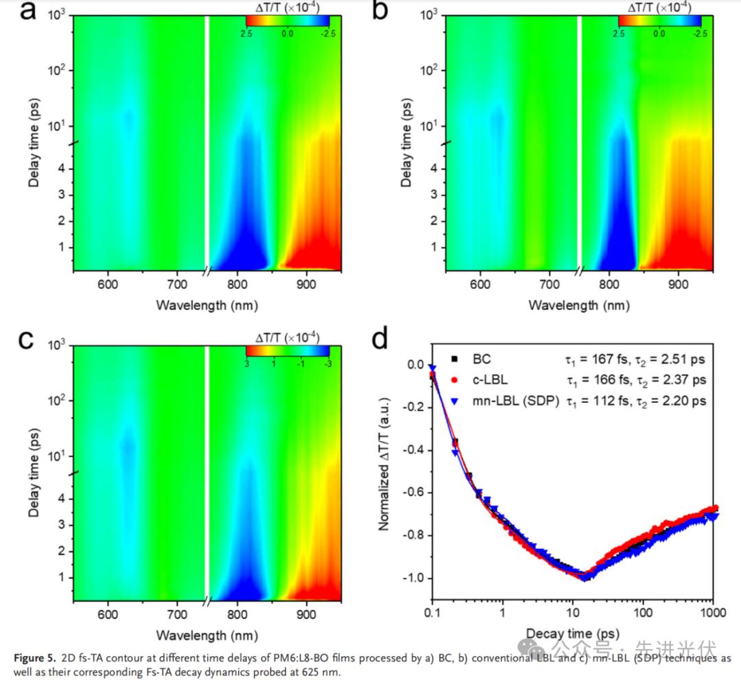 飞秒瞬态吸收(fs-TA)直接观测到SDP修饰体系的激子解离加速:在625 nm监测PM6基态漂白(GSB)动力学,mn-LBL(SDP)器件的空穴转移呈现双指数特征——超快组分τ₁=112 fs(界面直接解离),慢组分τ₂=2.20 ps(受体域内扩散)。相较之下,传统LBL工艺τ₁延迟至284 fs。二维光谱进一步显示:SDP体系在925 nm激发态吸收(ESA)信号强度提升40%,证实界面处激子解离效率增强。