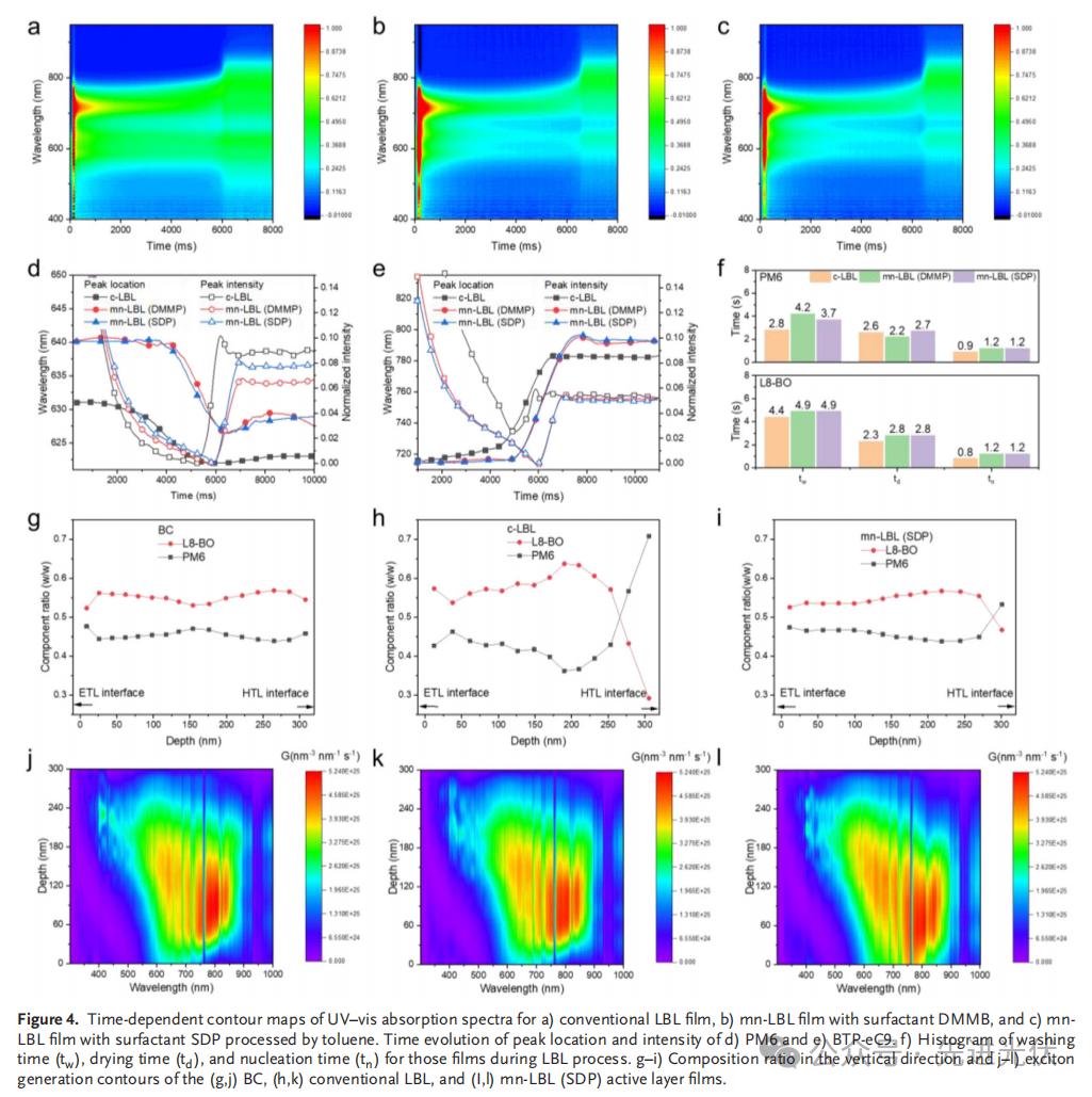 原位紫外监测揭示SDP介导的独特组装路径:与传统LBL相比,SDP体系清洗时间延长21%至7.6秒,促进受体深度渗透;干燥时间增加至14.2秒,驱动分子有序重组。FLAS深度剖析显示优异的垂直分布:传统LBL中,底部PM6富集区占比超70%(相分离严重;mn-LBL(SDP)中,底部PM6浓度梯度上升(45%→65%),中部形成宽域激子产生区。介孔网络引导受体分子在300 nm厚膜中形成连续渗透通道,使激子解离区厚度达220 nm(传统LBL仅150 nm),此梯度结构将电荷收集效率提升至89%,攻克厚膜器件核心瓶颈。
