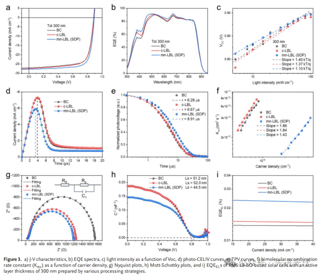在300 nm活性层中,mn-LBL(SDP)器件展现颠覆性性能:效率达18.87%(认证18.32%),显著优于BHJ(17.38%)和c-LBL(17.62%),其超高填充因子(FF=76.2%)源于优化的电荷管理。EQE光谱显示400-600 nm区域响应提升,与27.74 mA/cm²的Jsc匹配。光强依赖性斜率降至1.10 kT/q,陷阱辅助复合减少。Photo-CELIV测得空穴迁移率1.12×10⁻⁴ cm²/V·s;TPV载流子寿命增至8.91 μs,扩散长度突破50.8 nm。非辐射损失分析显示EQEEL提升至2.37×10⁻⁴,ΔE₃降至0.215 eV,为厚膜器件最高效率奠定基础。