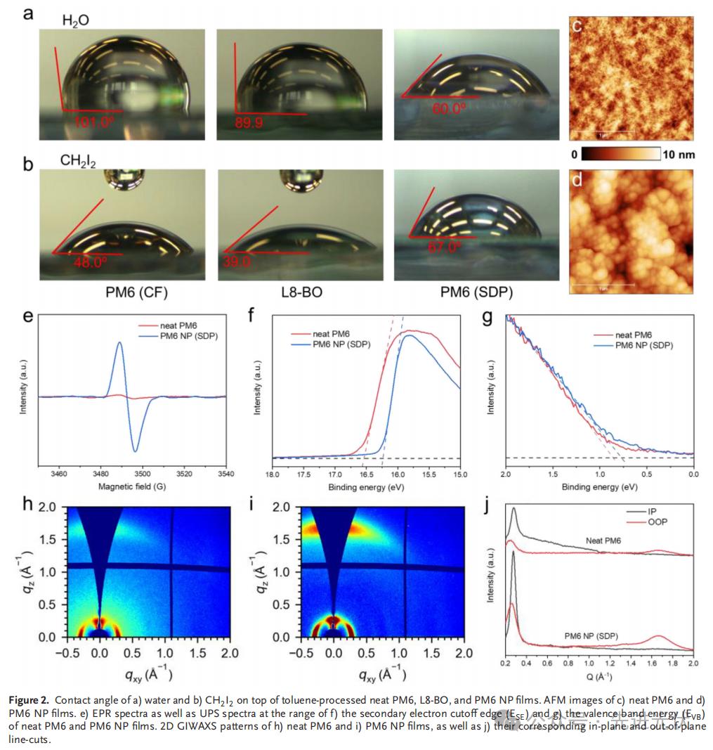 接触角测试显示PM6 NPs薄膜表面能提升至44.0 mN/m(vs 本体PM6的32.4 mN/m),归因于残留亲水基团增强受体相容性。AFM形貌证实介孔结构(粗糙度≈1.2 nm)促进后续受体渗透。EPR谱的348.8 mT特征峰证实SDP引发p型掺杂,自由基浓度较本体提升3倍。UPS能级分析量化掺杂效应:费米能级上移0.09 eV(-0.86→-0.77 eV),显著缩小HOMO-能级差。GIWAXS揭示分子排列优化:SDP使(010) π-π堆叠峰位从1.65 Å⁻¹移至1.68 Å⁻¹,结晶相干长度(CCL)增至18.2 nm(本体仅12.5 nm),建立高效垂直电荷传输通道。