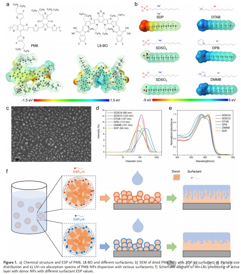 有机太阳能电池(OSCs)因其柔性、轻质和可溶液加工等优势,被视为新一代清洁能源技术。近年来单结器件效率已突破20%大关,但产业化进程却受限于一个致命瓶颈:光活性层的最佳厚度窗口极窄(仅100-120 nm)。一旦增厚,三大问题接踵而至:形貌稳定性恶化、激子解离效率下降、电荷复合损失加剧。而传统体异质结(BHJ)工艺难以在厚膜中构建理想的垂直相分离结构,导致电荷提取效率骤降;常规层层自组装(LBL)技术又面临给受体(D/A)互穿不足的挑战。在这项研究中,南昌大学陈义旺团队通过表面活性剂工程与纳米结构设计,实现了水基加工的高效厚膜OSCs。名为十二烷基磷酸钠(SDP)的表面活性剂具有双阴离子电荷,可产生特殊的静电势(ESP)差异,从而促进强大的供体-受体相互作用。这种静电工程能够在厚活性层中形成具有理想垂直梯度形貌的伪平面异质结结构(PPHJ)。因此,采用介观结构NP(mn)-LBL(SDP)策略处理的PM6:L8-BO二元OSCs表现出优异的厚度公差,在300 nm活性层下实现了18.9%的PCE(认证为18.3%)。此外,含有三元PM6:L8-BO:BTP-eC9的mn-LBL OSCs在非卤化水/甲苯溶剂体系中达到20.3%的冠军PCE(经认证为19.9%)。该研究以“Over 20% Efficient Water‐Based Layer‐by‐Layer Organic Solar Cells with High Thickness Tolerance Enabled by Surfactant Promoted Electrostatic Interaction”为题发表在顶级期刊Advanced Materials上。