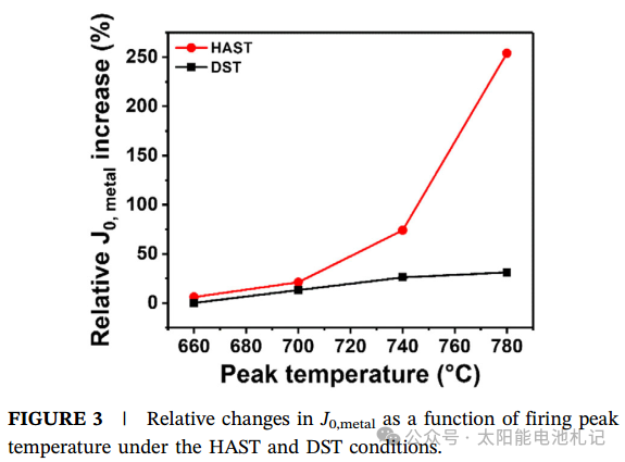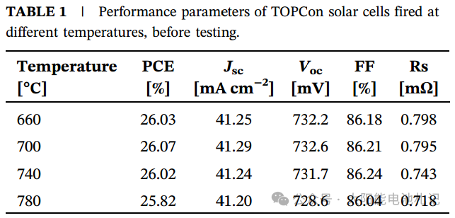研究团队通过对比660℃、700℃、740℃和780℃四种烧制温度发现:700℃烧制的电池初始效率最高(26.07%),且Voc(开路电压)和FF(填充因子)表现最优。当温度超过700℃时,金属诱导复合(J₀,metal)急剧上升,导致效率降低: