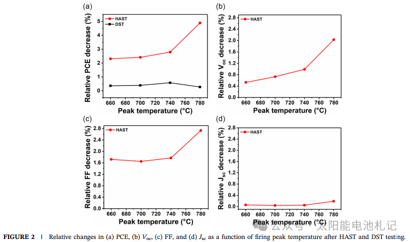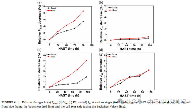 通过加速老化测试[highly accelerated temperature and humidity stress testing(HAST) and dry thermal stress testing(DST),团队发现,水分渗透是降解主因:HAST(85℃/85%RH)测试后,电池效率下降高达5.89%,而单纯高温(DST)仅下降0.58%。