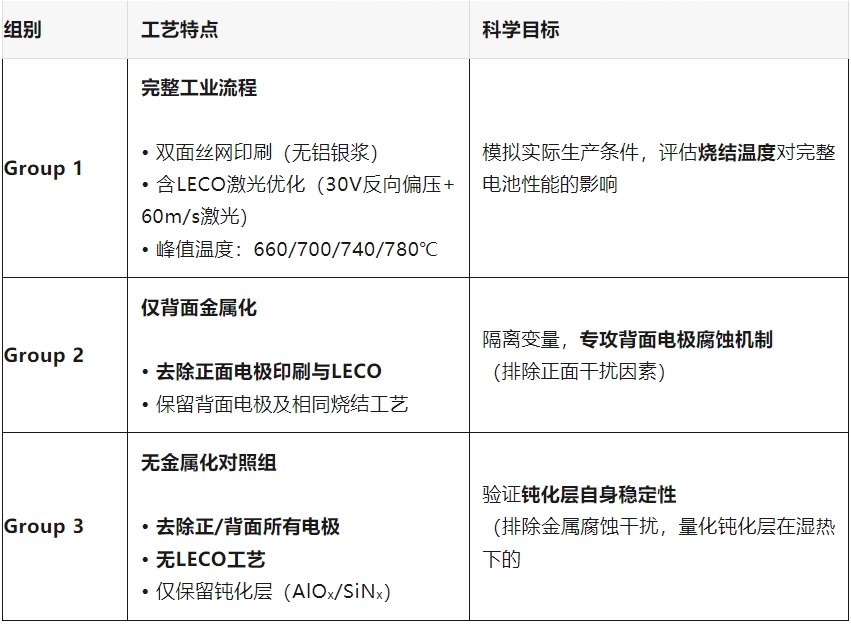 Group 3 → 排除金属干扰,证实TOPCon钝化层在湿热下稳定(衰减<3%)