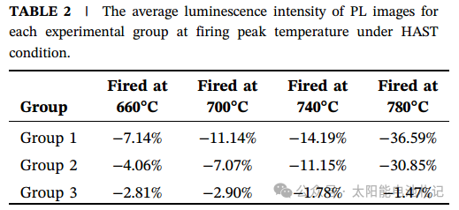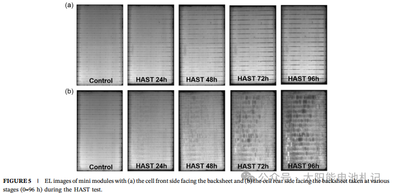 2. 前后电极的差异化腐蚀研究团队设定了3组样品对比湿热腐蚀衰减,通过电致发光(EL)成像和微型组件测试发现: