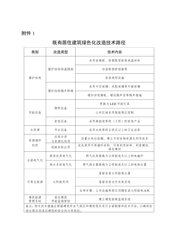 (一)提高既有居住建筑节能水平。提升城镇既有居住建筑绿色低碳性能,重点对外墙、屋面、外窗等部位实施保温隔热改造,推广应用节能隔声门窗、遮阳设施等适宜技术(附件1)。结合城镇老旧小区改造,在保障安全的前提下,因地制宜增设雨水回收利用系统等技术措施。优化公共区域照明、增设无障碍通道,完善适老化功能。引导居民在更换门窗、空调、壁挂炉等部品及设备时,采购高能效产品。鼓励采用设备变频控制等节能技术,降低公共区域能耗。