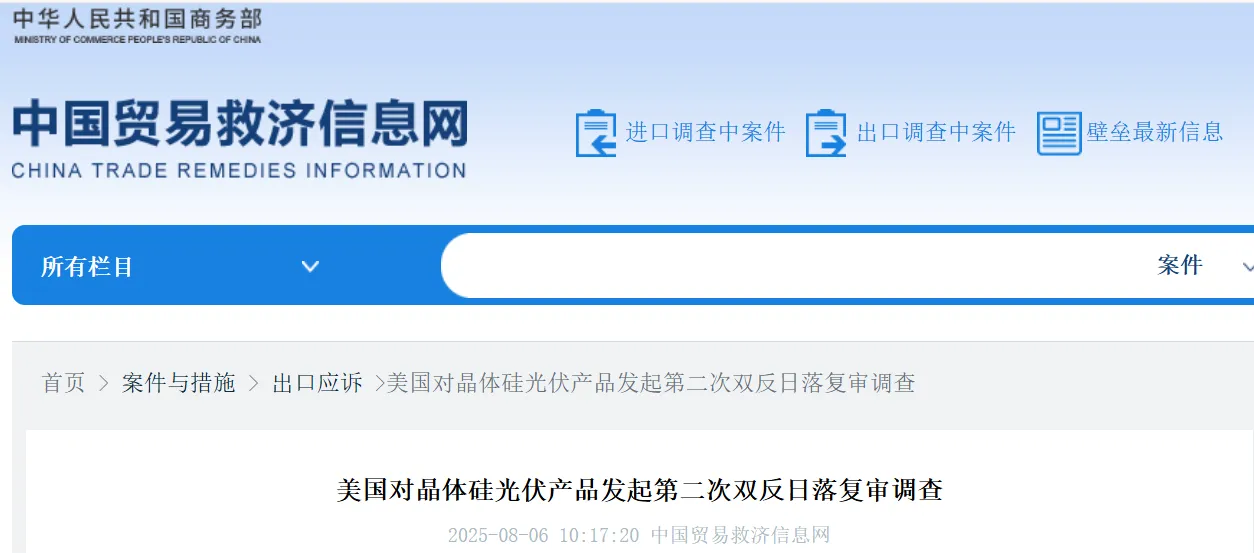 中国贸易救济信息网消息,2025年8月1日,美国商务部发布公告,对进口自中国的晶体硅光伏产品(Crystalline Silicon Photovoltaic Products)发起第二次反倾销和反补贴日落复审调查,对进口自中国台湾地区的涉案产品发起第二次反倾销日落复审调查。