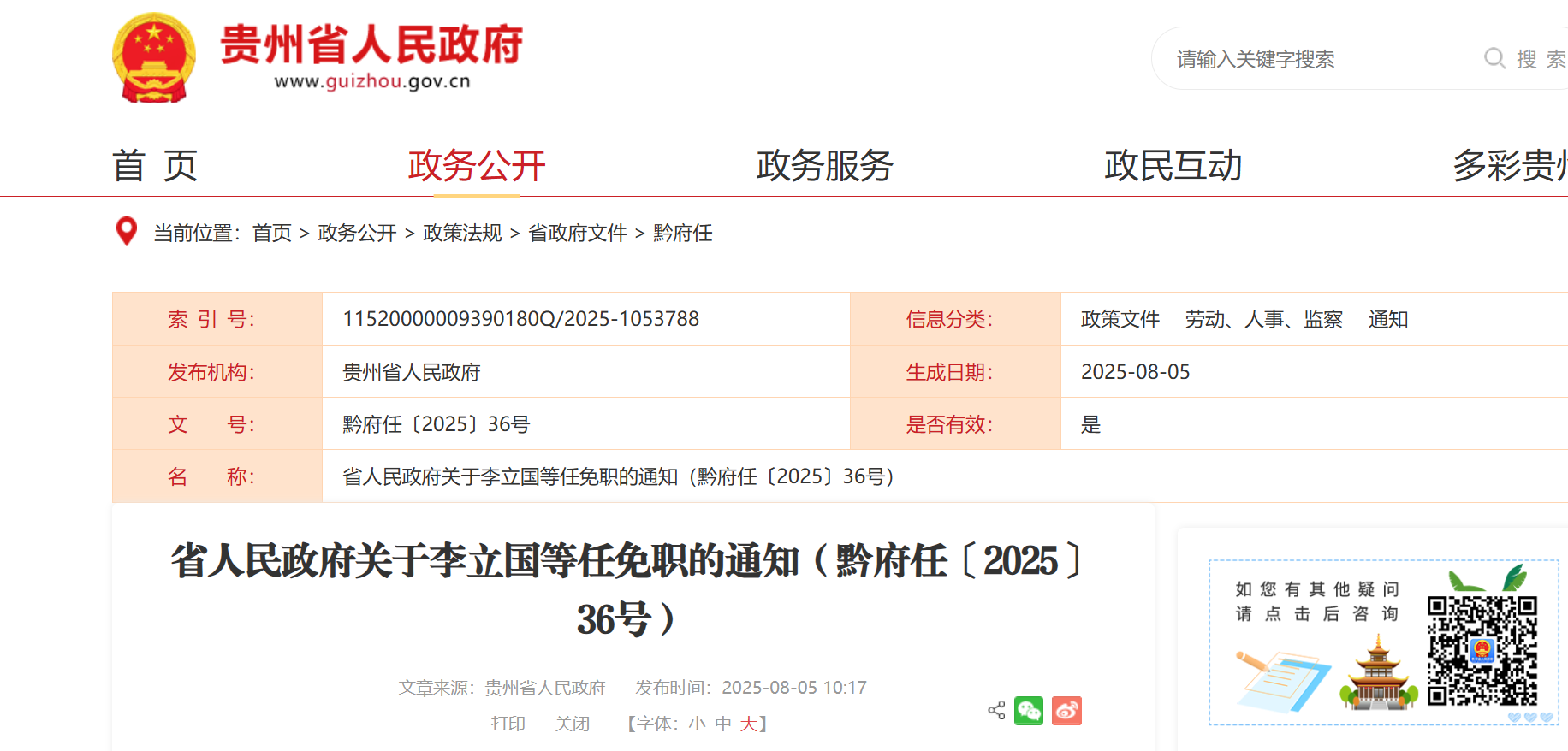 8月5日,贵州省人民政府关于李立国等任免职的通知。省人民政府决定:李立国正式任贵州省发展和改革委员会副主任,任职时间从2024年6月起计算。