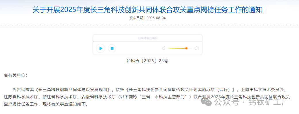 8月4日,上海市科学技术委员会、江苏省科学技术厅、浙江省科学技术厅、安徽省科学技术厅(以下简称“三省一市科技主管部门”)联合发布关于开展2025年度长三角科技创新共同体联合攻关重点揭榜任务工作的通知。
