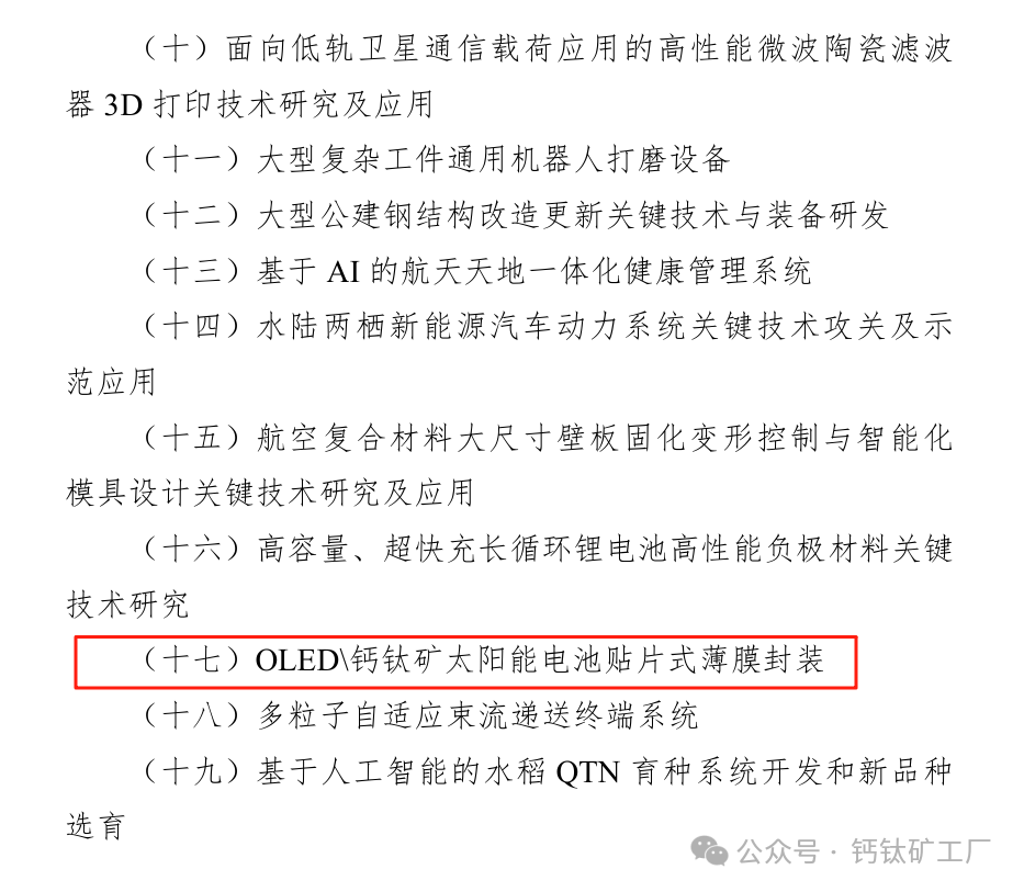 在未来产业领域,OLED\钙钛矿太阳能电池贴片式薄膜封装攻关项目位列其中。
