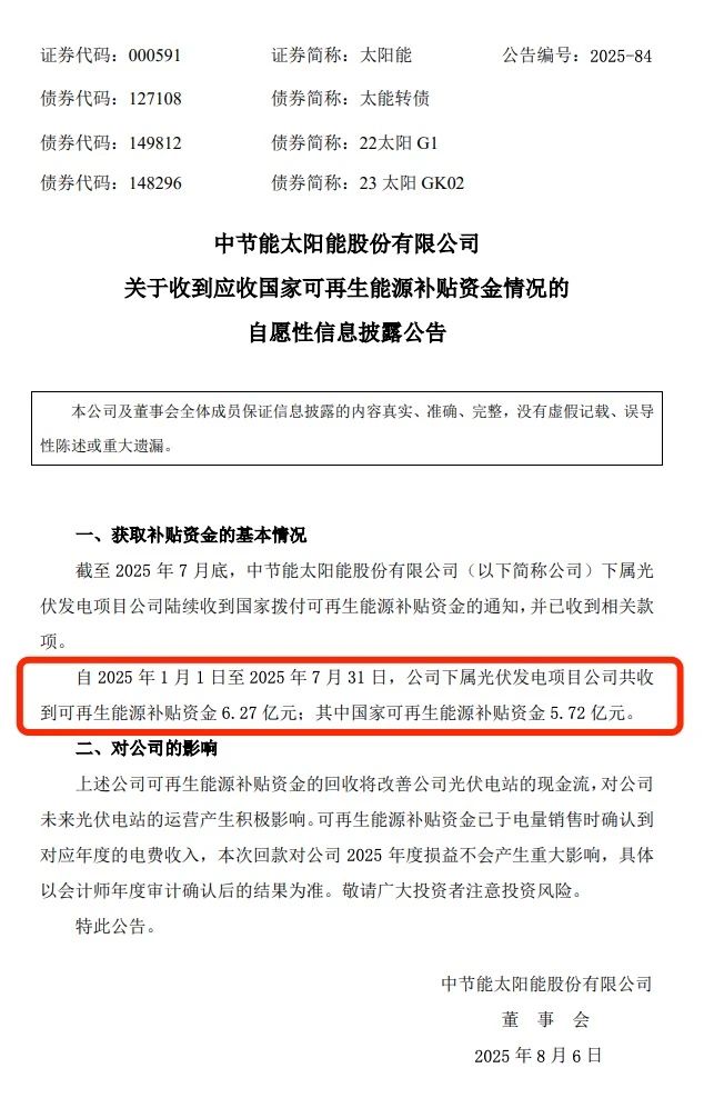 8月6日,中节能太阳能发布公告,披露了公司及其下属光伏电站在2025年前七个月收到可再生能源补贴资金情况。