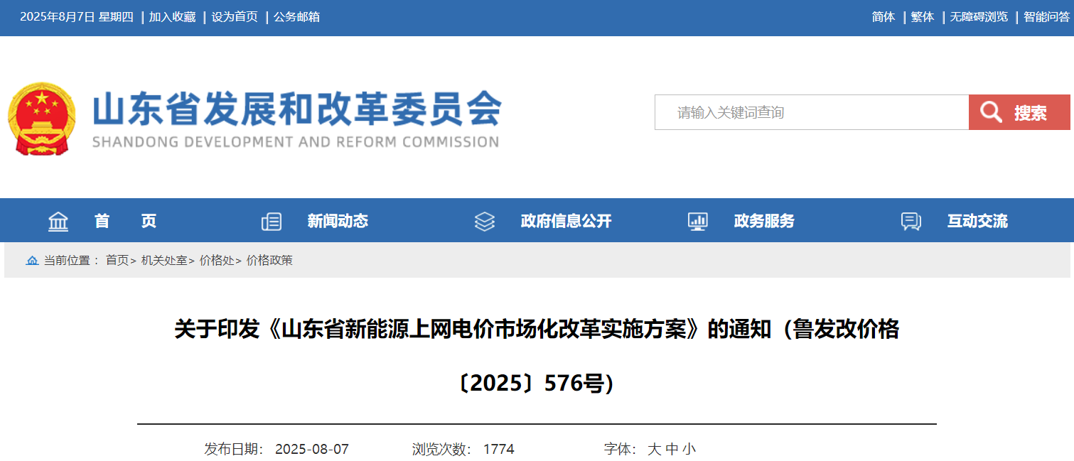 2025年2月,国家发展改革委、国家能源局印发《关于深化新能源上网电价市场化改革 促进新能源高质量发展的通知》(发改价格〔2025〕136号),对新能源上网电价市场化改革工作进行了全面部署。山东省作为绿色低碳高质量发展先行区,落实国家改革要求,出台《山东省新能源上网电价市场化改革实施方案》,以推动新能源上网电量全面进入市场、上网电价全面由市场形成。