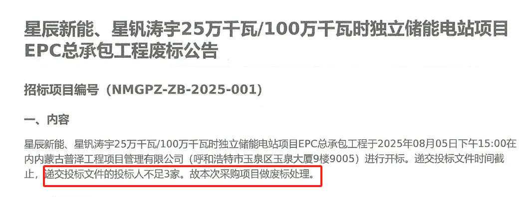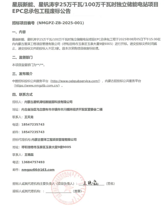 8月5日,星辰新能、星钒涛宇25万千瓦/100万千瓦时独立储能电站项目EPC总承包工程废标公告发布。