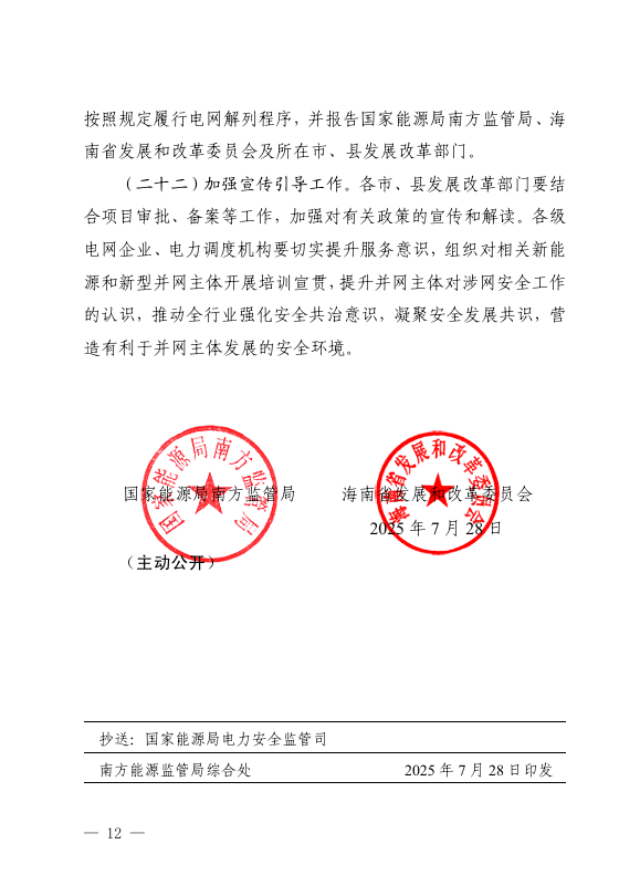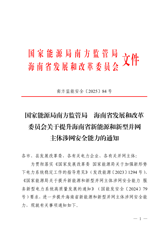 国家能源局南方监管局与海南省发改委联合发布《关于提升海南省新能源和新型并网主体涉网安全能力的通知》,针对海南省新能源与新型并网主体快速发展带来的安全挑战,提出系统性管理要求。