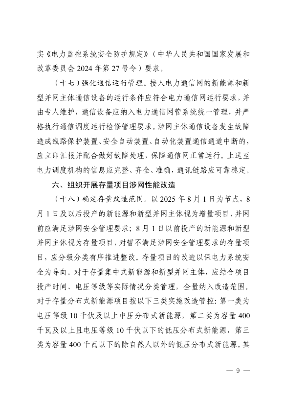 《通知》还强调通过优化涉网管理服务、规范参数管理、强化并网验收及运行监控等措施提升安全性能,并针对存量项目制定分级分类改造计划,要求2027年底前完成全量改造。此外,文件提出健全监管机制、加强宣传引导,营造安全发展环境。
