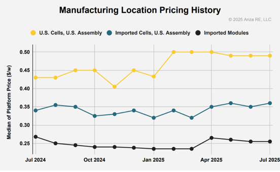 Anza的报告称:“与去年同期相比,国产电池片相对于进口组件的溢价扩大至约 0.23 美元/瓦,这反映出市场愿意为税收抵免、关税和关税确定性买单。”