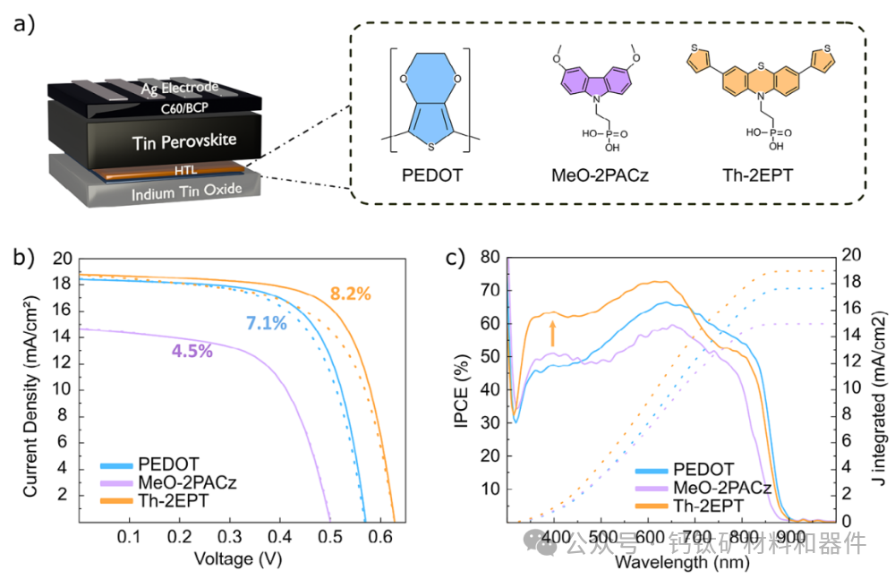 因此,该团队寻求替代的自组装单层(SAMs)分子,以实现更好的拟合。他们发现了吩噻嗪,一种含硫官能团,缩写为 Th-2EPT。立陶宛考纳斯理工大学的TadasMalinauskas博士和 Mantas Marčinskas博士合成了这种新化合物。与PEDOT相比,Th-2EPT能够形成具有相当结晶度的钙钛矿薄膜,尽管晶粒较小。采用 Th-2EPT 制成的 SAMs锡基钙钛矿太阳能电池优于采用 PEDOT:PSS或 MeO-2PACz 制成的对照电池。Th-2EPT 产生了非常好的界面,可最大限度地减少复合损耗。