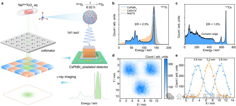 面对核医学成像中对高能量分辨率、高探测灵敏度与高空间分辨率的迫切需求,苏州大学与西北大学等多家科研团队合作,成功开发出基于钙钛矿CsPbBr₃的像素化γ射线探测器,实现了单光子级别的γ射线成像。该研究通过化学机械表面处理技术显著提升了电荷收集效率(CCE)的均匀性与器件稳定性,结合多通道电子学读出系统,在核医学常用的¹⁴¹ keV(⁹⁹ᵐTc)和662 keV(¹³⁷Cs)γ射线能量下分别实现了2.5%与1.0%的突破性能量分辨率,并成功完成了⁹⁹ᵐTc点源、线源及Derenzo仿体的高清晰成像,空间分辨率达3.2–3.8 mm。该研究以"Single photon γ-ray imaging with high energy and spatial resolution perovskite semiconductor for nuclear medicine"为题发表于Nature Communications。