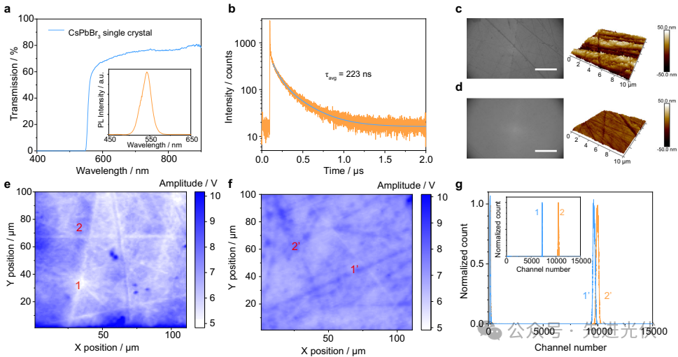 通过对比机械抛光(图2c)与DMSO化学机械抛光(图2d)的表面形貌,后者将表面粗糙度降低65%,使脉冲高度映射(图2f)响应均匀性提升3倍。光致发光成像证实DMSO处理能有效消除应力损伤层(图2e),而482nm脉冲激光微区测试(图2g)显示处理后各位置通道数偏差<2%,为像素化探测器的一致性奠定基础。