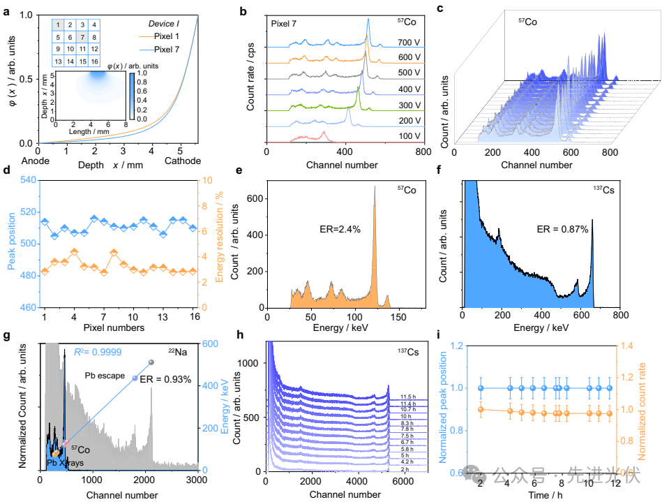 16个像素在57Co 122keV γ射线测试中(图3c)展现出2.7-4.4%的均匀能量分辨率,最佳像素在662keV达到0.87%的创纪录分辨率(图3f)。连续11小时测试(图3h-i)证实器件稳定性,峰值通道漂移<0.5%。特别值得注意的是22Na测试中511keV分辨率达0.93%(图3g),验证了探测器在正电子成像中的应用潜力。