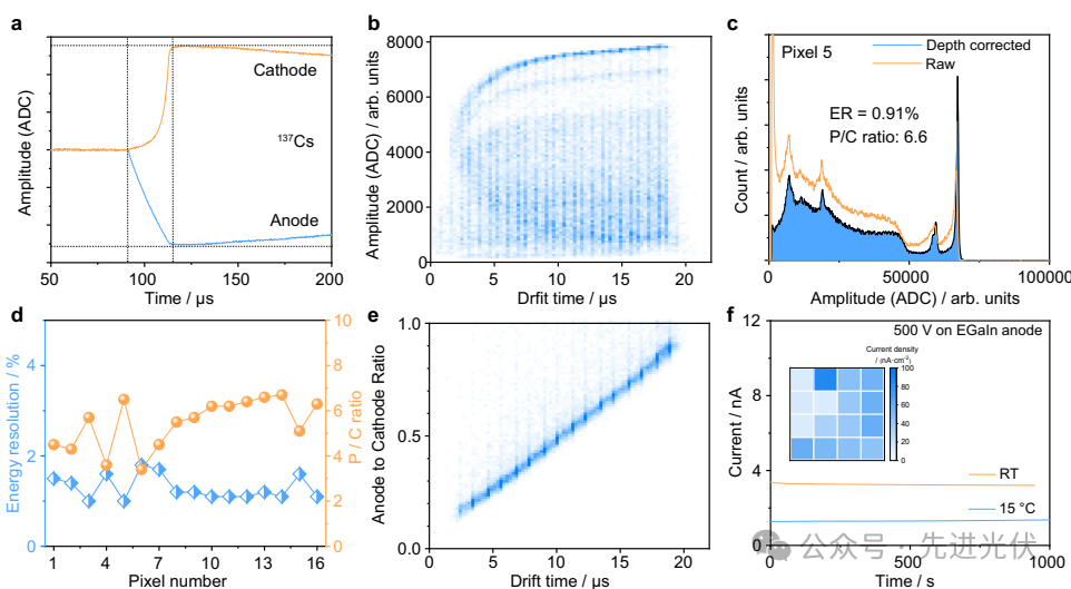 深度校正算法(图4b-c)将137Cs 662keV分辨率从1.9%提升至0.91%,P/C比从2.0增至6.6。图4d证实16像素在深度校正后保持0.9-1.6%的均匀分辨率,而图4f展示15℃冷却使像素漏电流降至0.3-2nA(15-86nA·cm⁻²),为高精度成像提供稳定基线。