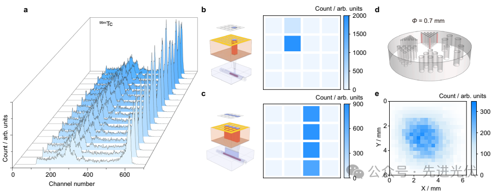 该图展示了核医学成像的核心应用场景。采用0.5mm孔径钨准直器时(图5b-c),系统对点/线源成像的本征空间分辨率达1.2-1.6mm。图5e的单柱源成像在2.05cm距离下清晰分辨0.7mm直径源,配合Derenzo模体测试(图1d-e)验证了探测器在SPECT系统中的实用价值。