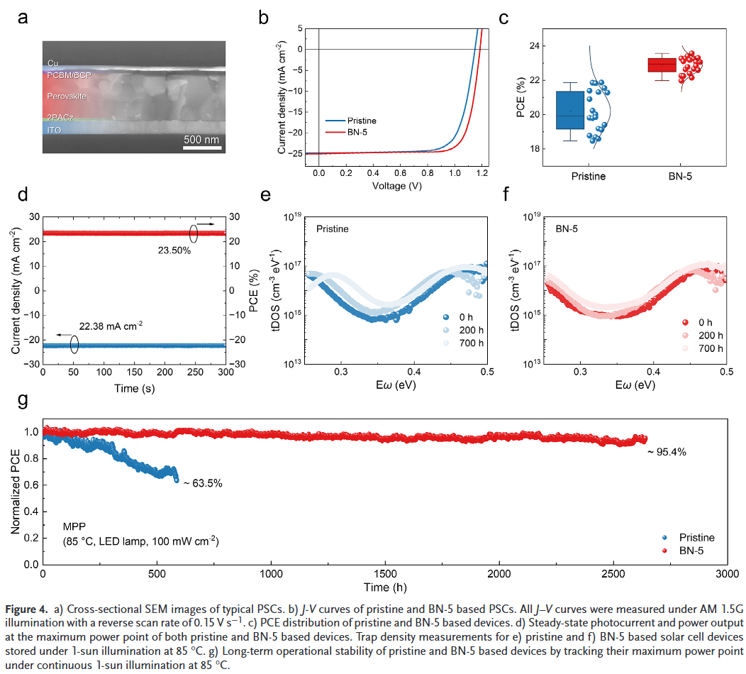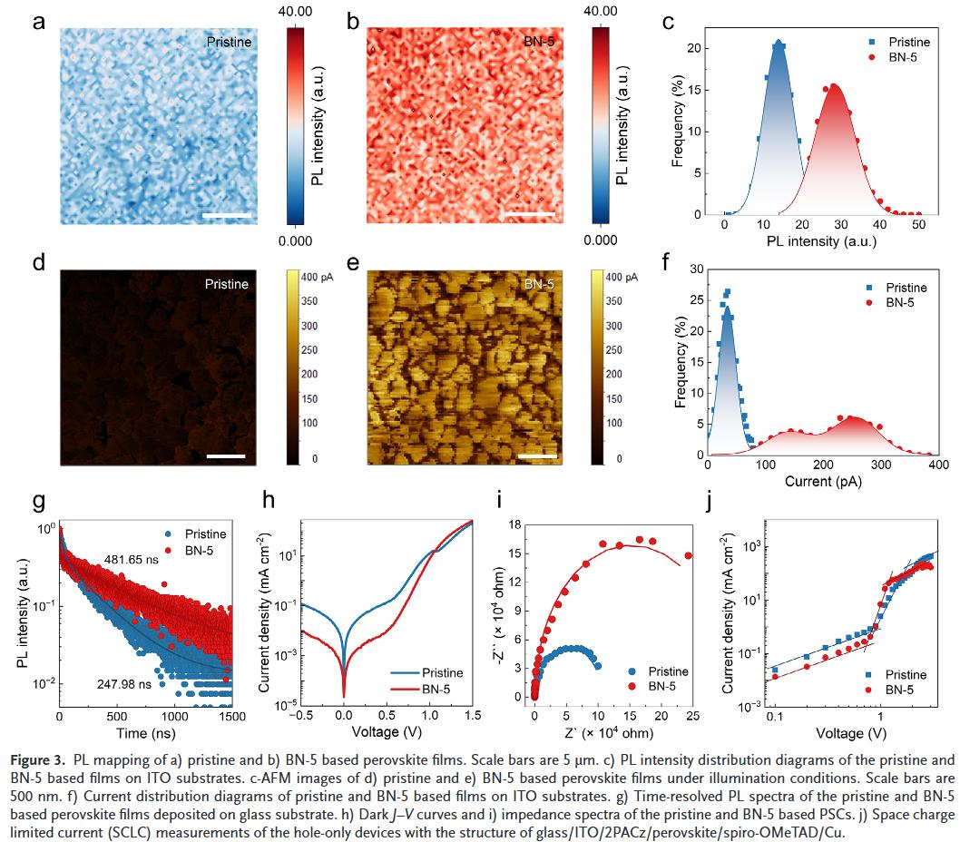 BN-5不仅增强热量耗散,还通过TP与钙钛矿中未配位铅离子相互作用,降低陷阱密度,延长载流子寿命,提升器件光电性能(PCE从21.66%升至23.47%)。