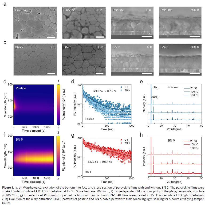 在85°C、1太阳光照下连续运行2640小时后,BN-5器件仍保持95%以上初始效率,而对照组仅剩63%,凸显其在高通量热应力下的卓越耐久性。