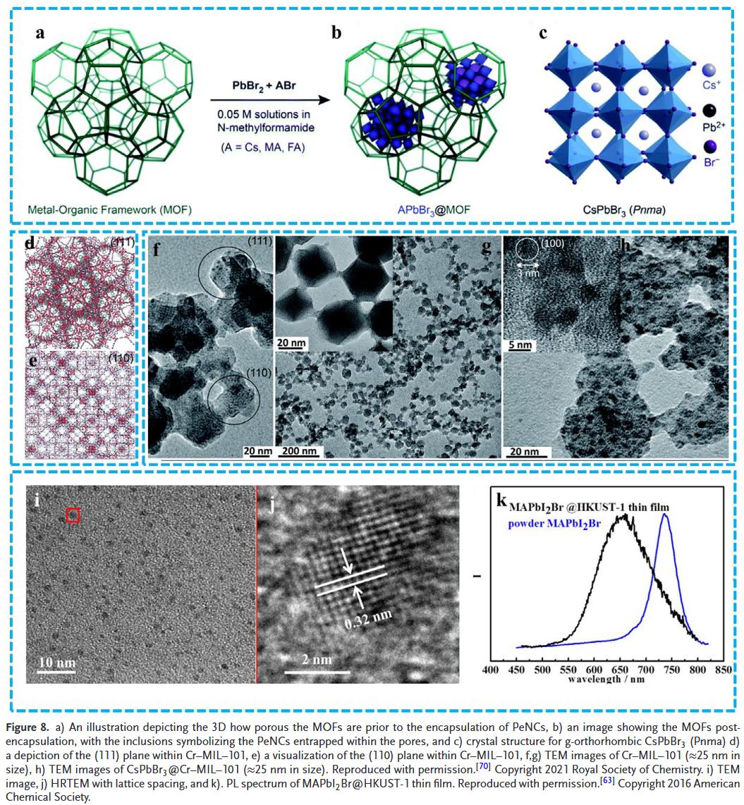 通过“瓶中船”和“船绕瓶”等策略将 PeNCs 封装于 MOFs 中,有效隔绝水氧、紫外光和高温,显著延长其使用寿命,并保持高荧光量子产率。