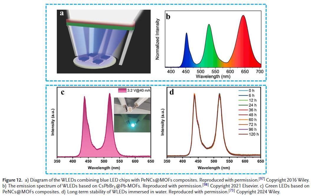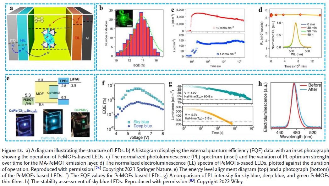 PeMOFs 不仅在太阳能电池和LED中表现优异,还拓展至光催化、离子传感、3D信息加密、X射线闪烁体等高附加值领域,展现出跨学科应用潜力。