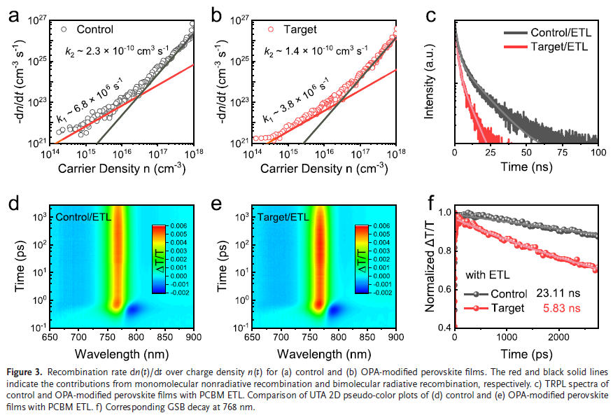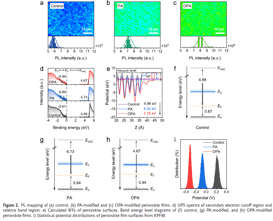 能带重构与电子提取增强:OPA修饰使钙钛矿表面费米能级上移,更匹配PCBM能级,加速电子提取,抑制界面复合。