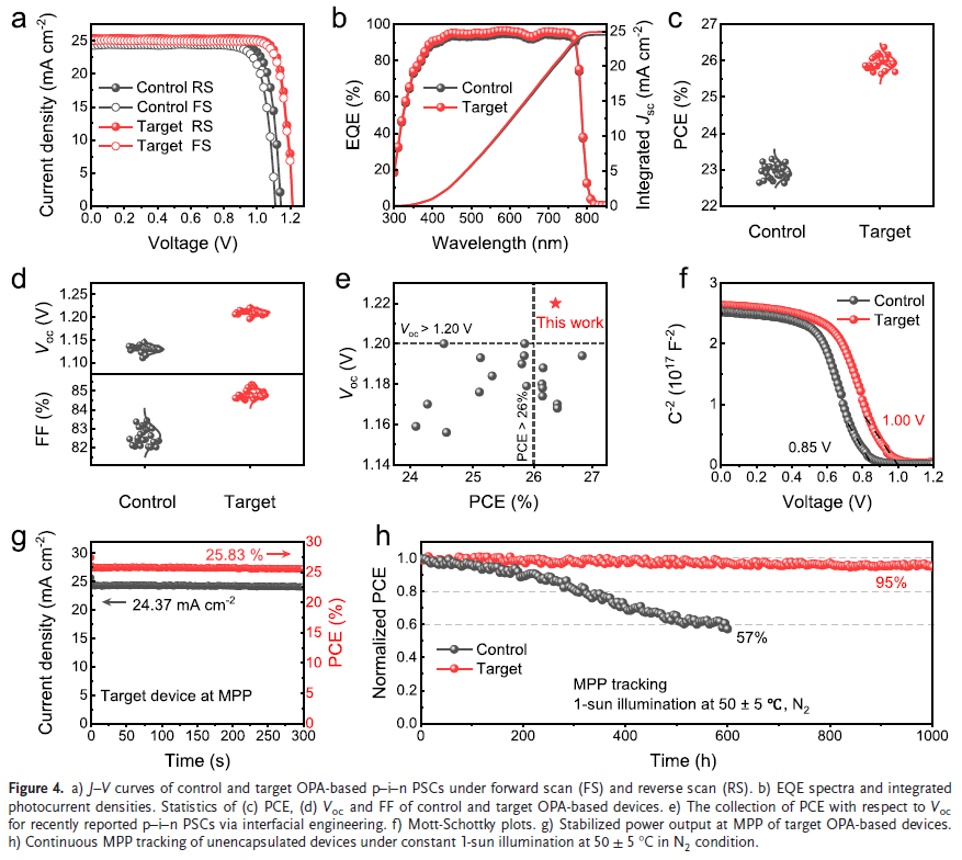 性能全面突破:实现26.3%的效率(对照组23.3%),光电压达1.215 V(p-i-n器件最高值之一),1000小时MPP跟踪后仍保持95%初始效率。