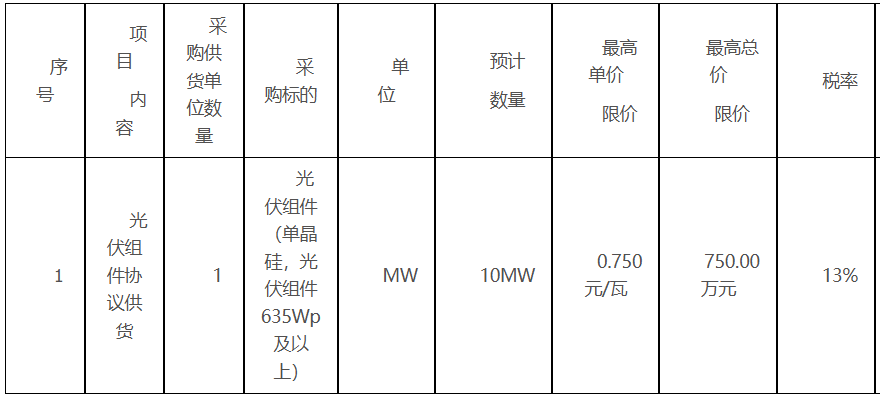 预计招标数量10MW,采购型号为单晶硅635Wp及以上光伏组件,最高单价限价0.750元/瓦。