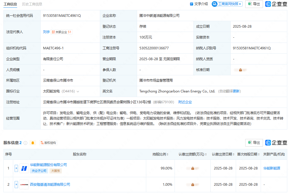 近日,腾冲中碳清洁能源有限公司成立,法定代表人为刘宇。