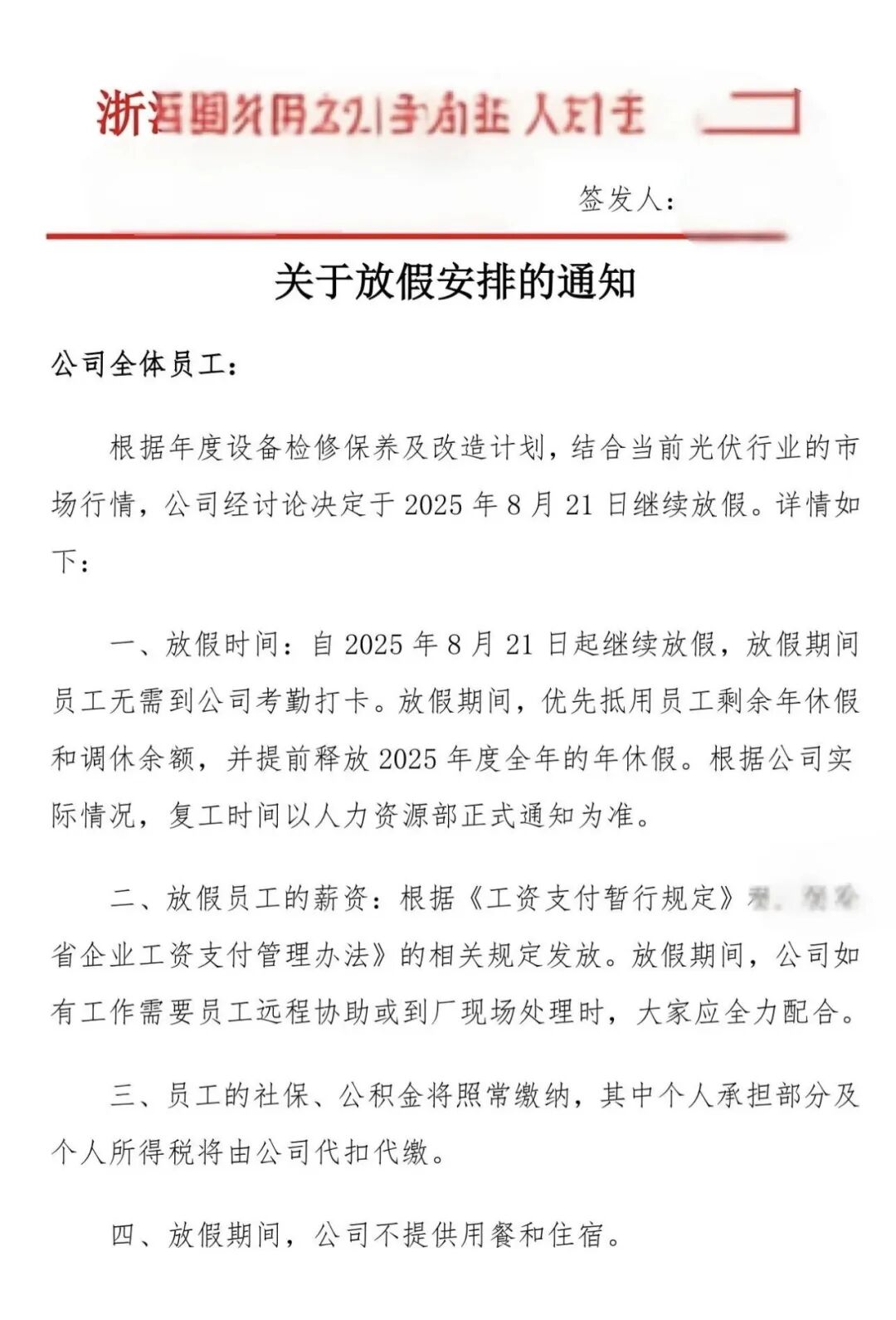 近日,一光伏企业发布放假安排通知。该通知提到,根据年度设备检修保养及改造计划,结合当前光伏行业的市场行情,公司经讨论决定于2025年8月21日继续放假。放假期间,优先抵用员工剩余年休假和调休余额,并提前释放2025年度全年的年休假。