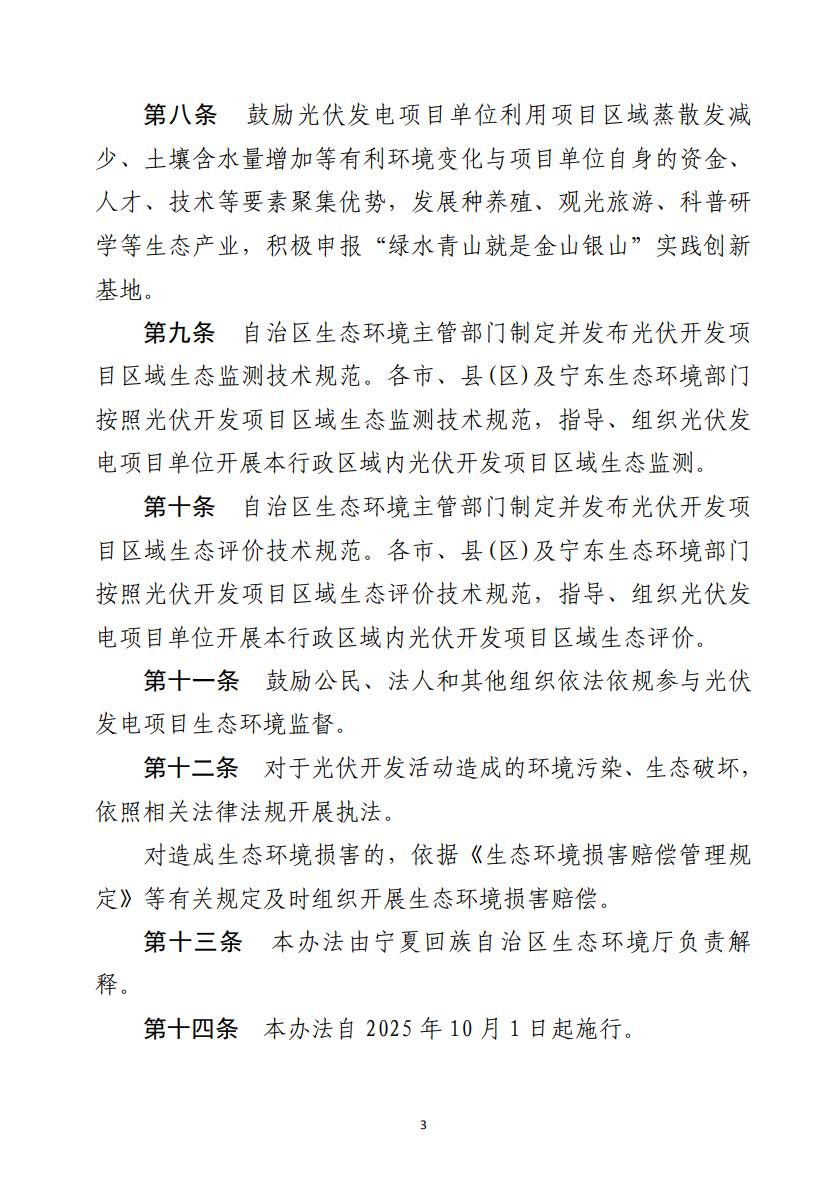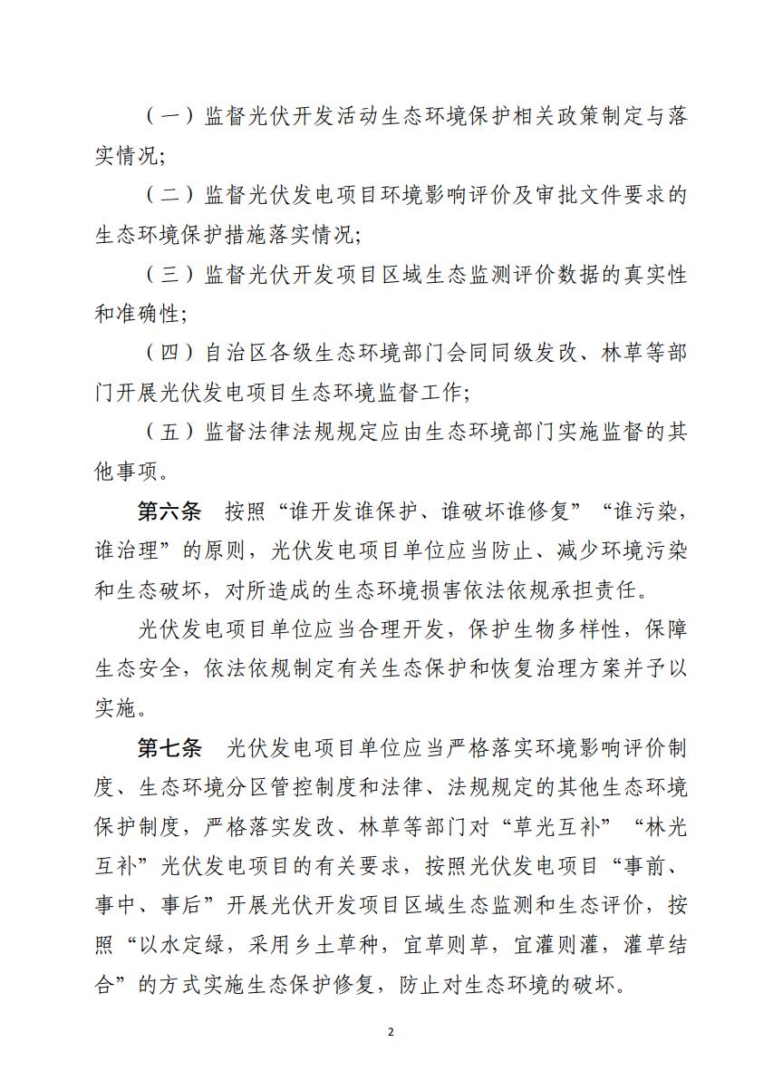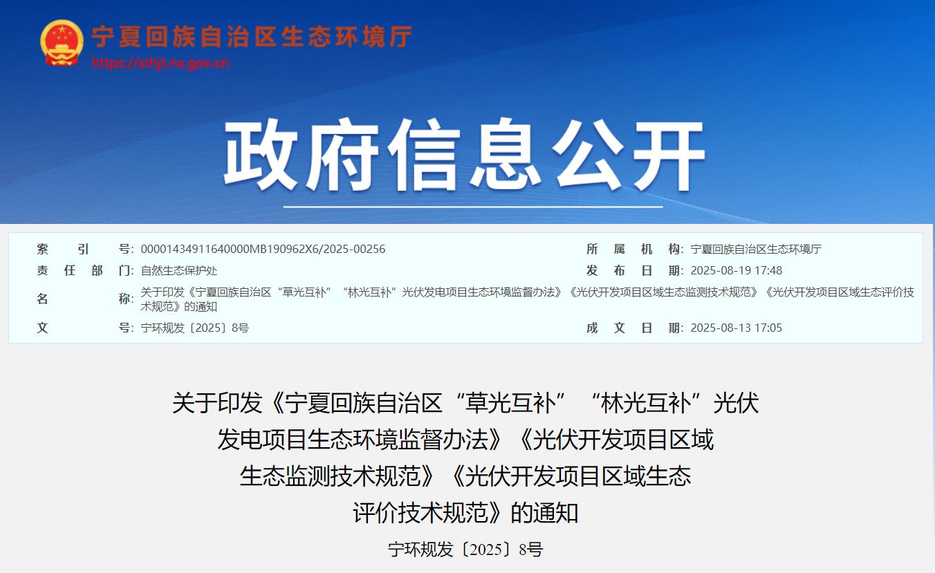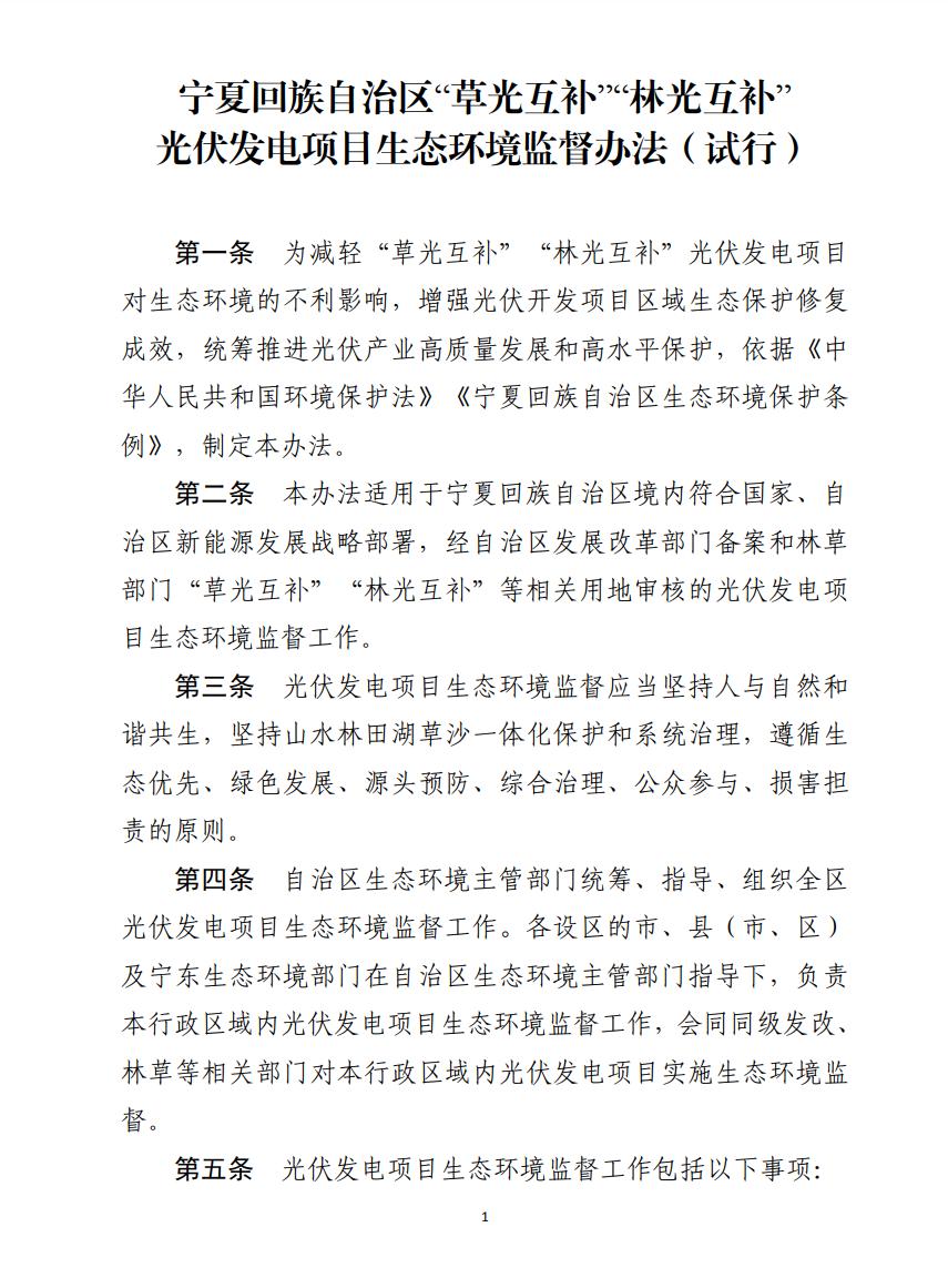 日前,关于印发《宁夏回族自治区“草光互补”“林光互补”光伏发电项目生态环境监督办法》《光伏开发项目区域生态监测技术规范》《光伏开发项目区域生态评价技术规范》的通知。其中提到,按照光伏发电项目“事前、事中、事后”开展光伏开发项目区域生态监测和生态评价,按照“以水定绿,采用乡土草种,宜草则草,宜灌则灌,灌草结合”的方式实施生态保护修复,防止对生态环境的破坏。鼓励光伏发电项目单位利用项目区域蒸散发减少土壤含水量增加等有利环境变化与项目单位自身的资金、人才、技术等要素聚集优势。
