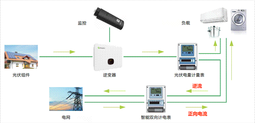 在供配电系统中,通常是由配电变压器向负载供电,电流由电网侧流向负载,形成正向电流。若光伏发电功率超过本地负载消纳能力,多余电能会馈入电网。由于该电流方向与常规相反,被称为逆流。