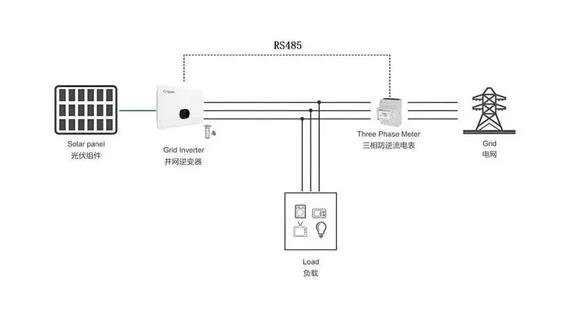 适用于单相系统,安装一块单相防逆流电表,电表通过RS485通讯线与光伏逆变器连接,将检测数据实时反馈给逆变器,实现光伏自发自用,余电不上网。
