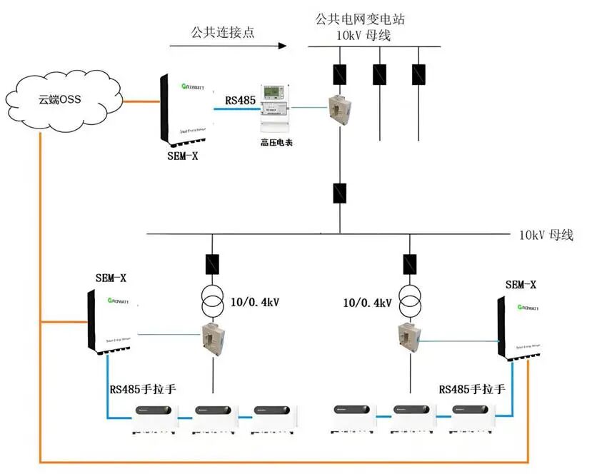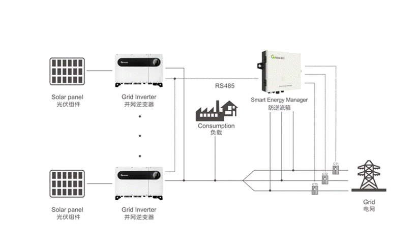 智慧能源管理器位于逆变器、用户负载和电网之间。多台光伏逆变器之间通过RS485通讯线手拉手方式接入智慧能源管理器,由其根据实时监测数据调节逆变器输出,实现防逆流。
