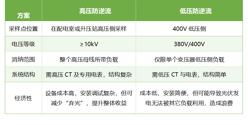 高压与低压防逆流方案在采样点位置、电压等级、消纳范围、系统复杂度和经济性等方面存在差异,具体对比如下: