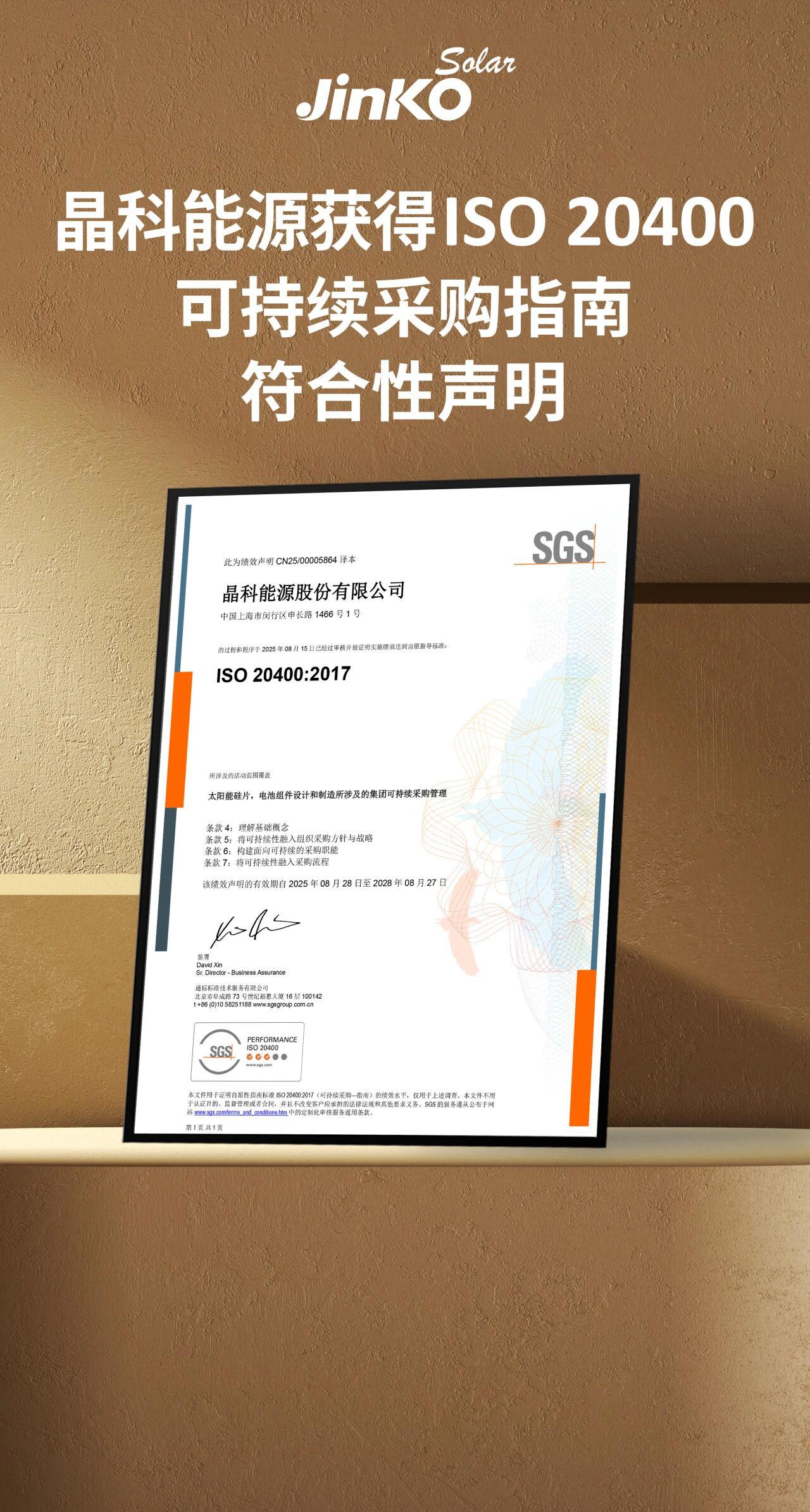 近日,全球领先光伏企业晶科能源顺利通过国际专业标准机构SGS的严格核查,成功获得《ISO 20400可持续采购指南》符合性声明。该认证不仅是对晶科能源在可持续采购体系专业化、规范化建设方面的高度认可,更标志着其在全面践行社会责任、推动绿色低碳发展方面取得重要突破。