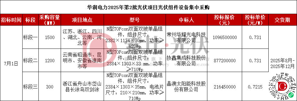 本次采购分为3个标段,共计采购N型TOPcon双面双玻光伏组件3GW,标段一采购容量为1500MW,中标人常州华耀光电科技有限公司,投标单价0.731元/W;