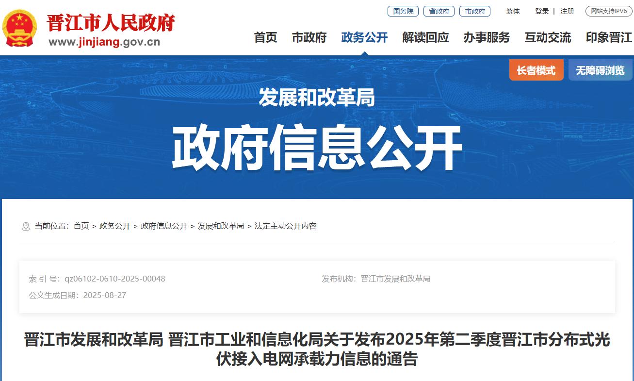 日前,晋江市工业和信息化局关于发布2025年第二季度晋江市分布式光伏接入电网承载力信息的通告。