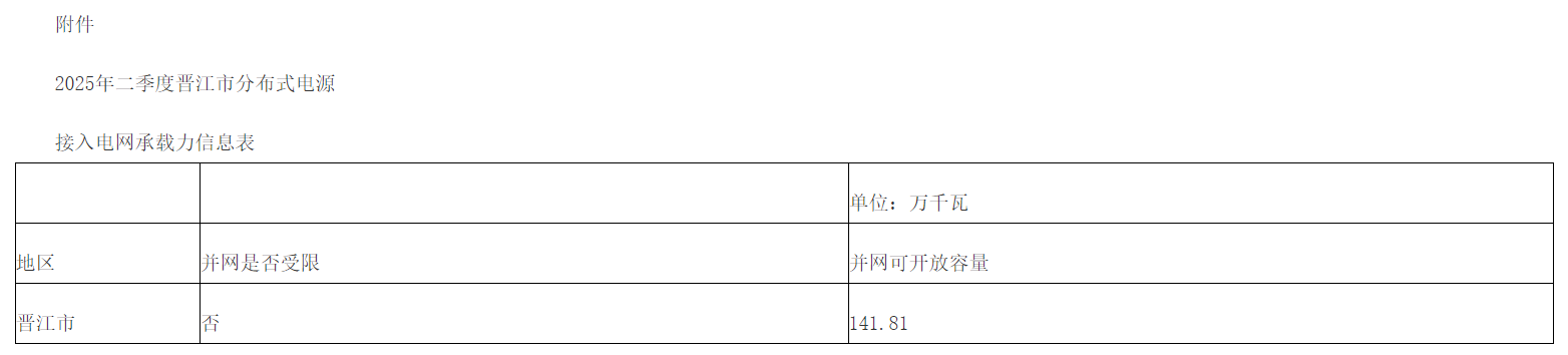 截至2025年第二季度,晋江地区分布式光伏并网可开放容量141.81万千瓦。具体情况详见附件。