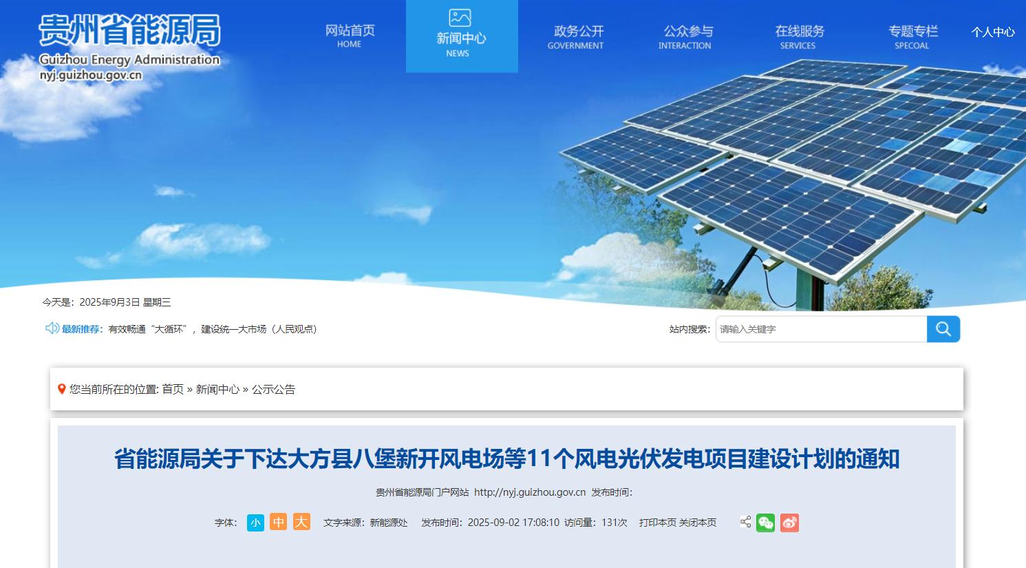 9月2日,贵州省能源局下发11个风电光伏发电项目建设计划,总规模为135万千瓦,项目全部位于贵州省毕节市。根据项目清单来看,中标企业分别为贵州能源集团以及华电,其中贵州能源获得728MW,华电获得622MW。